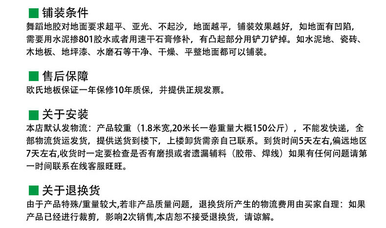 歐氏生產的所有舞蹈地膠質量符合中華人民共和國國家標準和企業標準.下述質量保證條款,保證我廠生產的地膠通常能適用于文藝演出舞臺,練功房,家庭健美房作地毯使用等公共場所.
